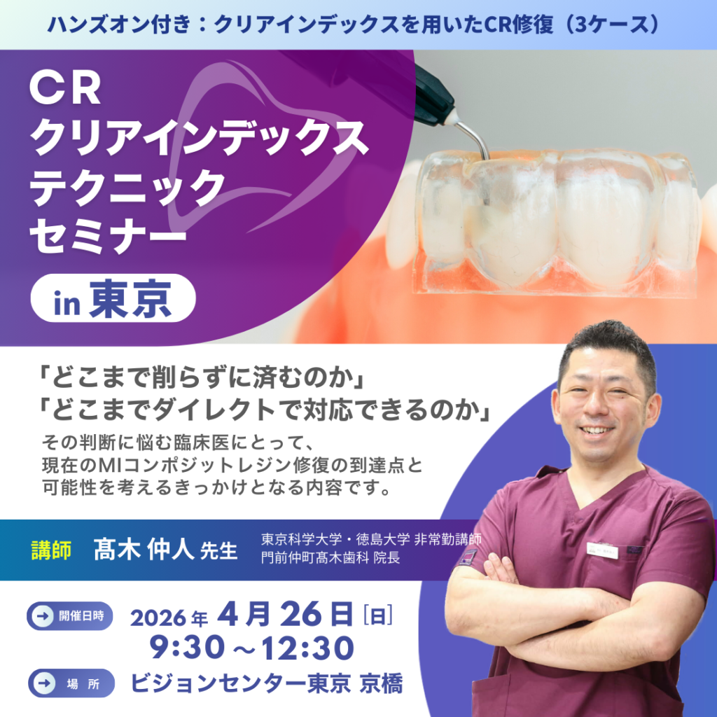 本セミナーでは、本テクニックを約2年間にわたり臨床応用し、残根歯や臼歯部欠損など、従来であれば間接修復が第一選択となり得た症例に対して、ダイレクト修復で真正面から取り組んできた実践例を共有します。