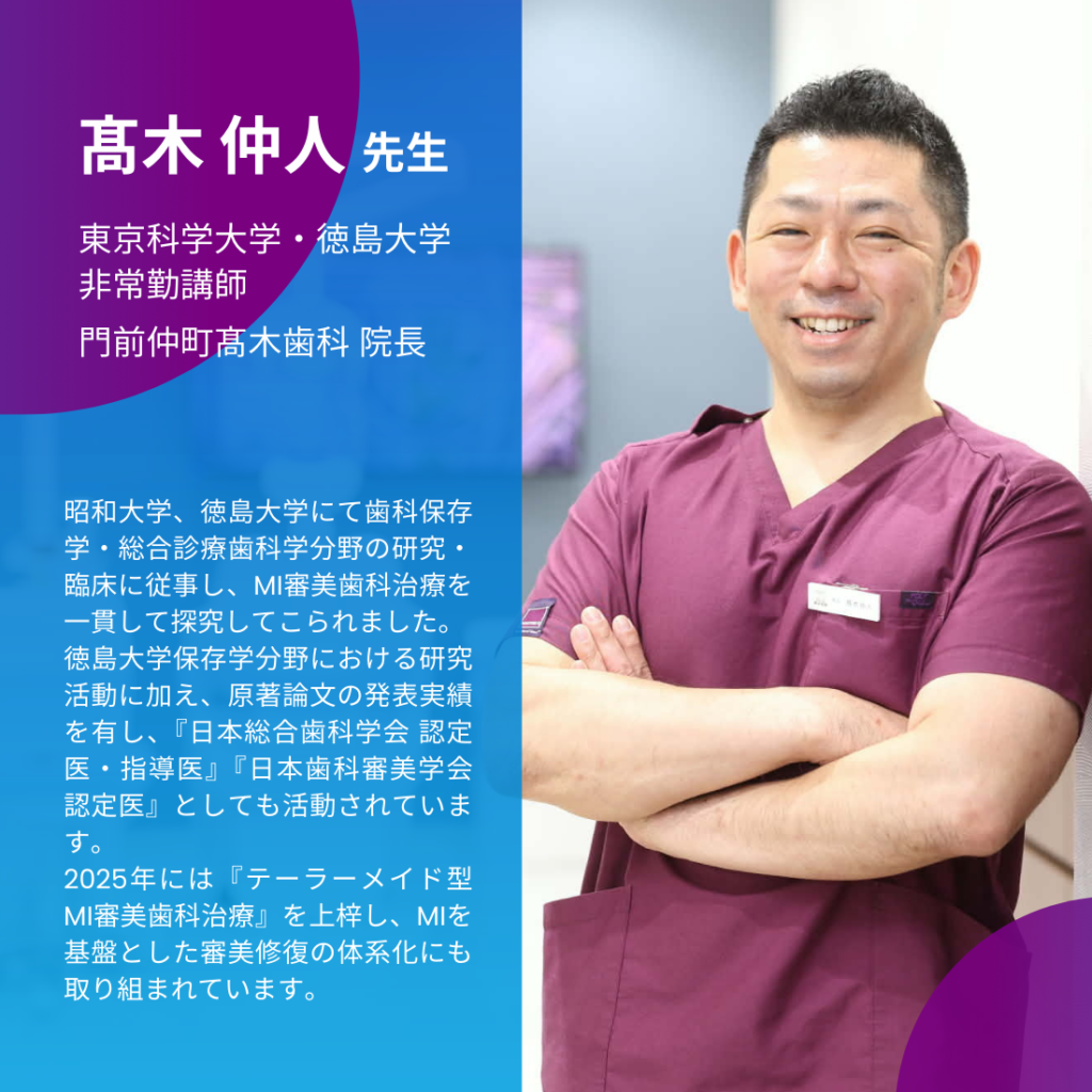 講師は、昭和大学、徳島大学にて歯科保存学・総合診療歯科学分野の研究・臨床に従事し、MI審美歯科治療を一貫して探究してこられた、門前仲町髙木歯科 院長 髙木 仲人 先生。